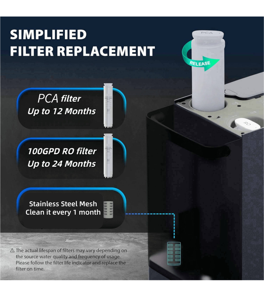 🔹 Greitas filtrų keitimas ir ilgas tarnavimo laikas RO membrana keičiama paprastu pasukimu – nereikia jokių įrankių. Šarminis anglies filtras keičiamas tiesiog ištraukiant seną ir įstumiant naują. RO membrana tarnauja iki 12 mėnesių (priklauso nuo vandens kokybės ir naudojimo intensyvumo).