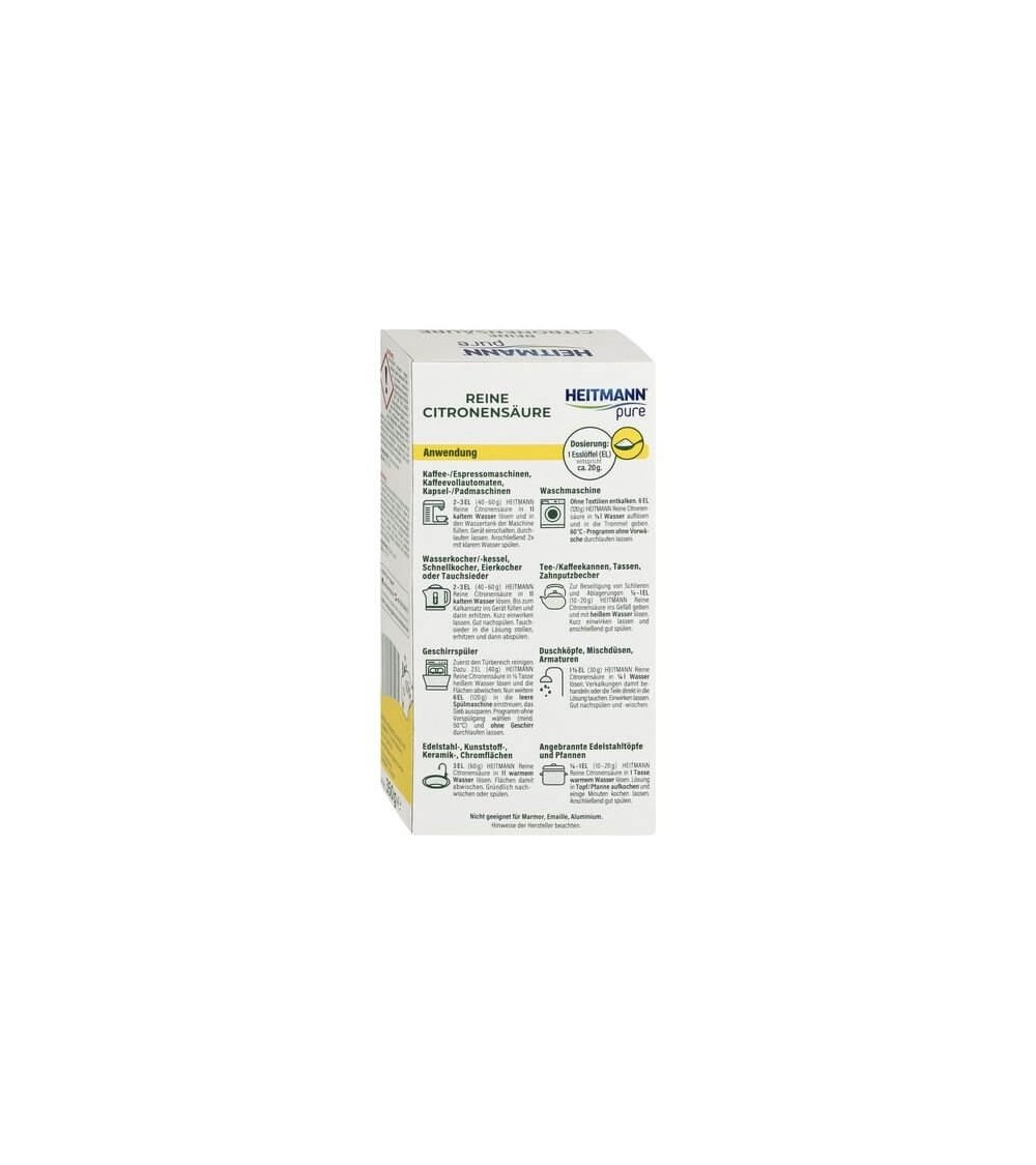 HEITMANN Ren Citronsyra löser upp kalk från apparater som använder vatten, förlänger deras livslängd och gör dem rena och livsmedelssäkra.